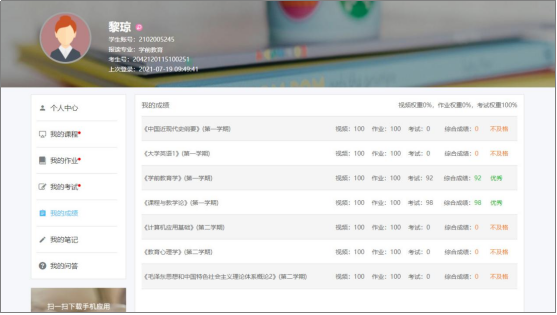 学生在“荆楚理工学院高等学历继续教育学习平台(良师)”平台进行学习和考试,课程总评成绩=期末考试成绩×50%+平时成绩×50%,课程总评成绩一般按百分制计算。部分课程的平时成绩如有直播课或实验实训,则计算方法为网课30%或40%、直播课10%、实验实训10%;若课程无直播课和实验实训,则网课成绩为50%。网课学习达到90%以上才能够参加考试。