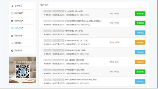 进入我的考试→可进行考试并查看试卷成绩,考试不及格可以补考。【如上图所示】