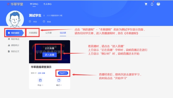 WEB端:选择主页面中的【我的课程】—【本期课程】—【进入直播】,即可观看直播课堂。