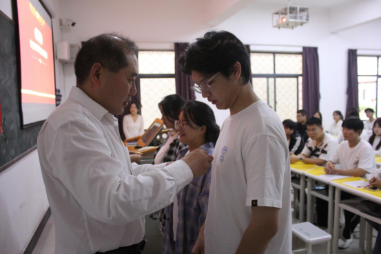 继续教育学院负责人为新党员佩戴党员徽章。小小的党徽承载着光荣与责任,更象征着党的精神的传承与延续。戴上党徽,意味着从此要以党员的标准严格要求自己,在学习和生活中时刻发挥先锋模范作用。
